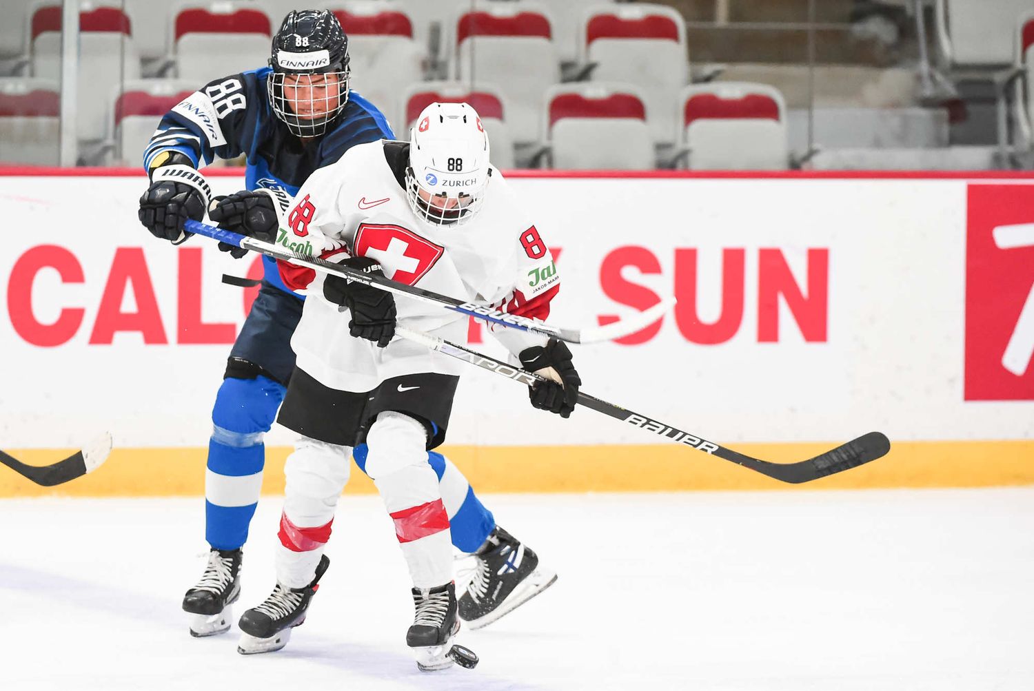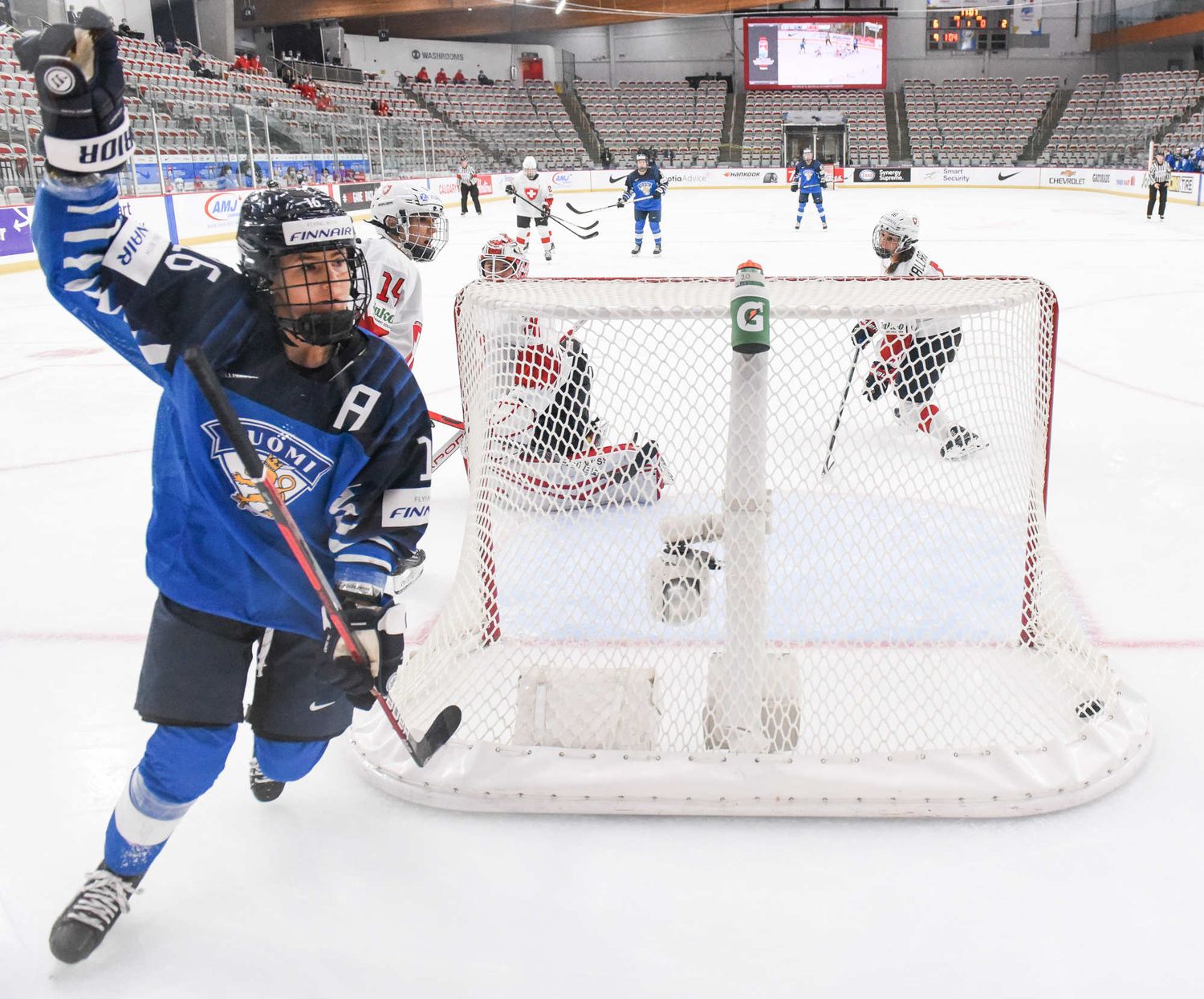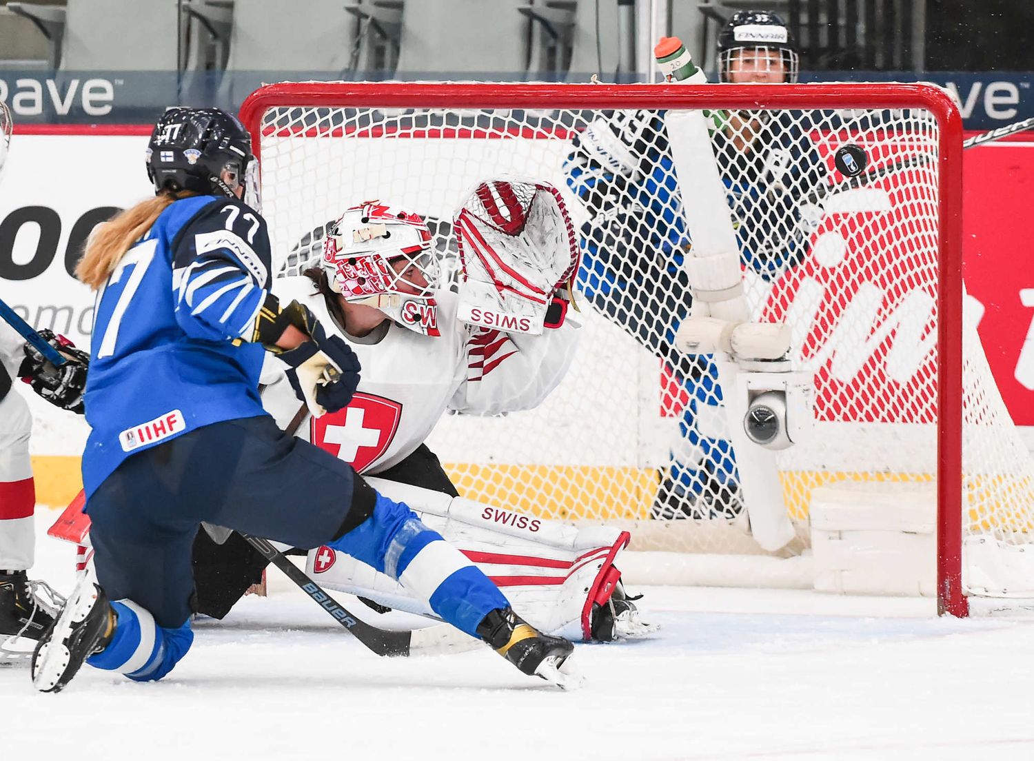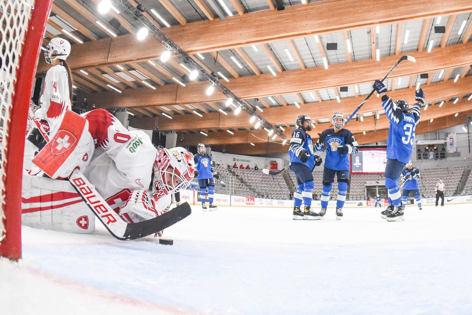 Petra Nieminen (16) a volé la vedette avec l’aide de ses coéquipières Michelle Karvinen (33) et Susanna Tapani (77) dans la victoire à sens unique de 6-0 des Finlandaises sur la Suisse au sein du Groupe A au Mondial féminin 2021 à Calgary.